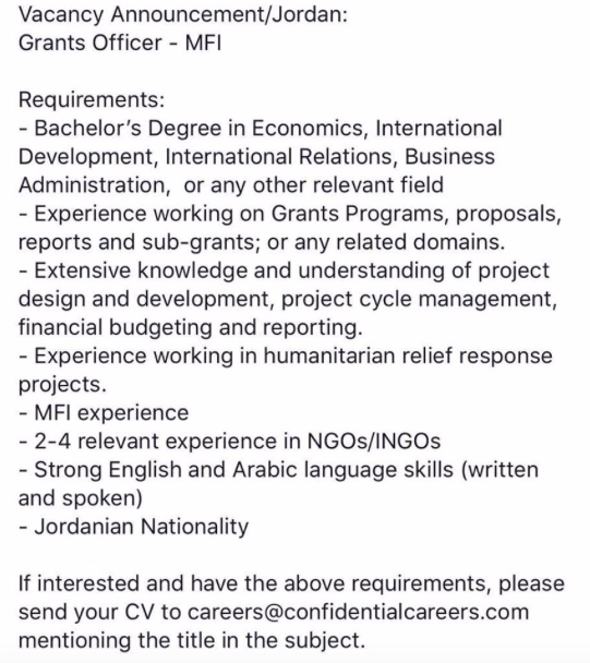 مطلوب موظف اردني الجنسية بتخصص اقتصاد - التنمية الدولية - ادارة الاعمال للعمل لدى منظمة غير ربحية في الاردن