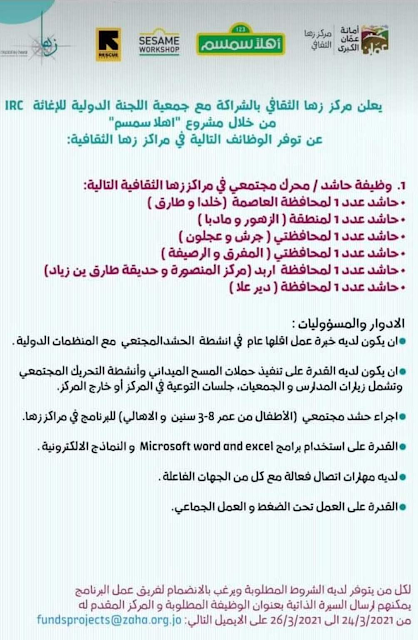 تعلن امانة عمان الكبرى ومركز زها الثقافي عن وظائف شاغرة في مختلف محافظات المملكة الاردنية